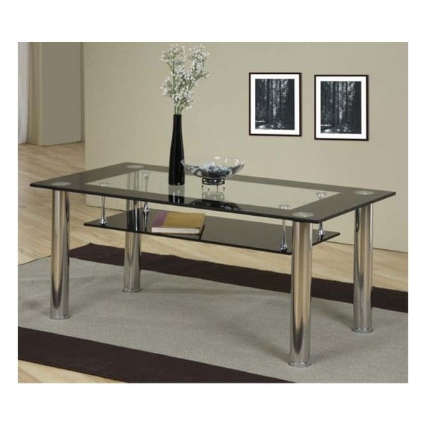 Club Coffee Table, High Quality Tempered Glass with Chrome Legs. Top is Clear Glass with Black Border and the Bottom Shelf is Black Glass.